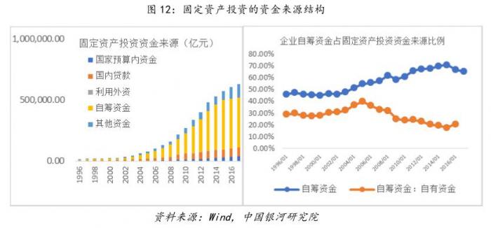 我国经济第一次起飞实际上是工业化过程,依靠大量固定资产投入。固定资产投入的资金来源主要是五个方面,一是国家预算内资金;二是国内贷款;三是利用外资;四是自筹资金;五是其他资金来源。目前国内贷款已从过去的20%以上降至12%左右,更多资金需要企业自筹。2005年前后自筹资金占固定资产总资金来源的50%左右,目前已高达65%,2017年企业自筹资金已超过40万亿的规模(如图12所示),但与过去60%的自筹资金来源于企事业单位自有资金不同,2016年自有资金仅占企业自筹资金的30%,这意味有近30万亿的自筹缺口需要金融市场特别是直接融资市场来满足。