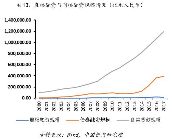 从社会的融资规模看,我国目前融资方式主要是银行贷款,而股权融资和债权融资规模占比均不高,扣除了大部分的国债和政府债券后,企业的债券融资规模还在进一步缩小。(如图13所示)
