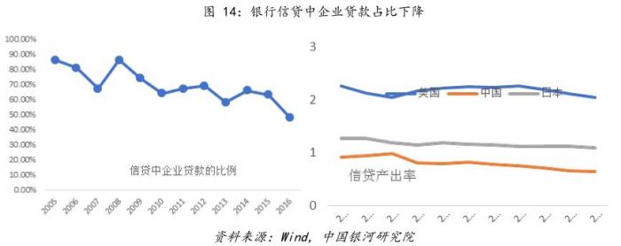 银行的资产结构正在发生变化:过去企业贷款占了银行贷款资产的80%以上,目前这一比例已降至不到50%(如图14左所示)。并且贷款对经济增长的边际贡献率也在持续下降,2016年我国的贷款产出率(GDP/银行对企业和居民信贷余额)已降至0.64%,而同期美国和日本的贷款产出率分别为2%和1.1%(如图14右所示)。