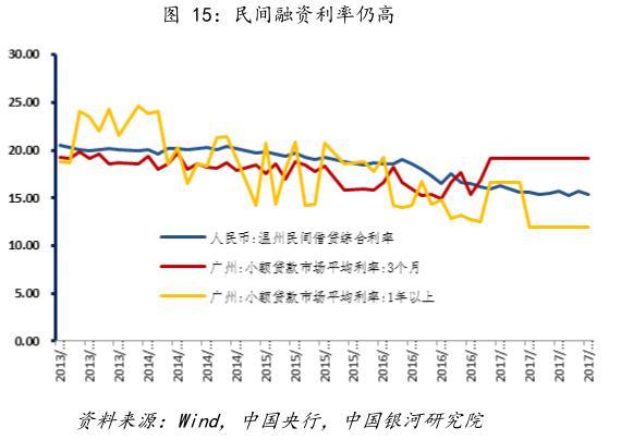 金融对实体经济支持力度不足的一个关键原因是资金运用效率低下。一边是民间企业融资难、融资贵的问题长期难以解决,比如2017年温州和广州等地民间融资利率大多仍维持了15%以上的高位(如图15所示);另一边是大量资金仍投向政府、国企、房地产或者滞留在金融体系内部,而民间投资,特别是长期投资,缺少权益明晰、定价合理、交易便捷和风险可控的投资标的资产,造成所谓的“资产荒”。