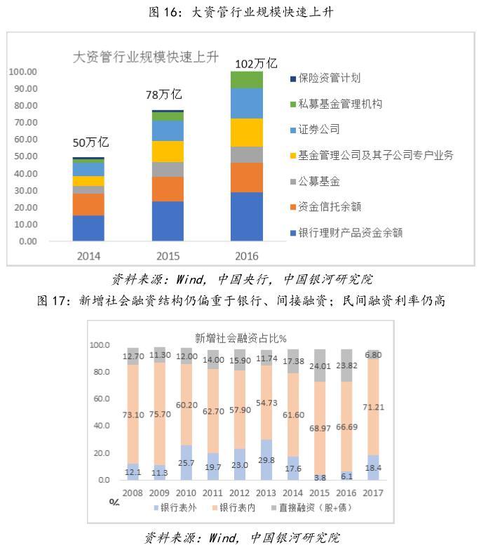 近几年,以影子银行为代表的大资管产品快速增长,2016年末产品余额已超过100万亿元人民币(部分重复计算)(如图16所示),已赶上当年的贷款余额,相当于存款余额的2/3,但直接融资比例却仍仅20%左右(如图17所示),远低于美、日等发达国家至少60%以上的直接融资比例。券商、保险、信托、PE、投行、资管、基金等的大资管产品大多成了银行规避监管的通道,本质上充当了银行表外业务的销售渠道,而资金最终大都形成了“类贷款”投向了政府、国企、房地产等传统银行贷款领域,或者滞留在了金融体系内部循环,形成金融“堰塞湖”,交易成本和监管成本都很大,并产生了许多套利机会,如制度和监管套利、通道和牌照套利、跨市场和流动性套利等等,严重扭曲了市场定价机制,金融产品和服务的收益和风险关系混乱。