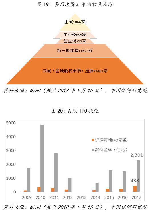 目前我国已有主板、中小板、创业板、新三板以及区域性股权交易市场(如图19所示)。截至2017年年末,沪深交易所上市公司接近3500家,总市值超过56万亿元,A股市场已经成为全球第二大股票市场。首先,A股上市审批门槛仍高。虽然2017年A股IPO加速,沪深两市共438宗IPO(如图20所示),创历史新高,同比增长93%,融资规模2351亿元,同比增长56%,但排队IPO的企业仍较多。其次,相当一部分企业多年不分红或象征性分红。此外,目前全国中小企业股份转让系统挂牌公司1.2万家左右,区域股权市场挂牌超过7万家,但融资功能远没有得到发挥。