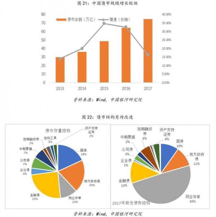 2016年我国债券市场规模经过两年平均30%的增长(如图21所示),已排名全球第三,但主要集中于国债、金融债、地方政府债和同业存单,四者存量比例目前是73%(如图22左所示),企业债、公司债比例仍然较低,两者加起来不到11%。虽然我国非金融部门杠杆率高达140%、居全球前列,但企业债券融资比例却非常低。2017 年公司债、企业债的债券发行规模仅1.68万亿元,占全部债券发行量的4.22%(如图22右所示),占比不仅没有扩大,反而有所收缩。我国债券市场、尤其是企业债券和公司债市场开放度不高,层层审批、多头管理问题较为严重,导致债券市场发展缓慢,中小企业很难从资本市场上获得债权融资。