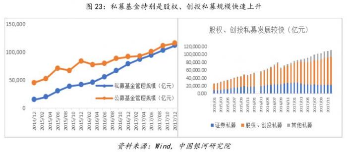 私募股权创投基金、互联网金融等新兴领域近年发展迅猛,但规模效应有限。截至2017年底,基金管理公司及其子公司、证券公司、期货公司、私募基金管理机构的资产管理业务总规模约54万亿元,其中私募基金成为全行业增速最快的领域,2017年管理资金规模同比增长40.66%,突破11万亿元(如图23左所示),直追公募基金,这其中私募股权、创投基金边际贡献最大,2017年增长了2.4万亿(如图23右所示)。