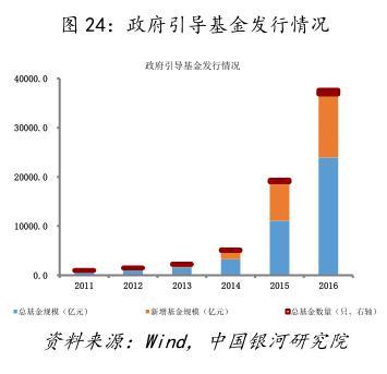 随着PPP模式的推广和股权投资的兴起,产业基金进入快速发展期。截至2017年三季度,全国共成立政府引导基金1408支,基金目标总规模8.58万亿(如图24所示)。但由于高回报的退出通道较少,基金资金沉淀严重,且市场化程度较低,普遍存在明股实债的安排,也隐藏了一些风险。