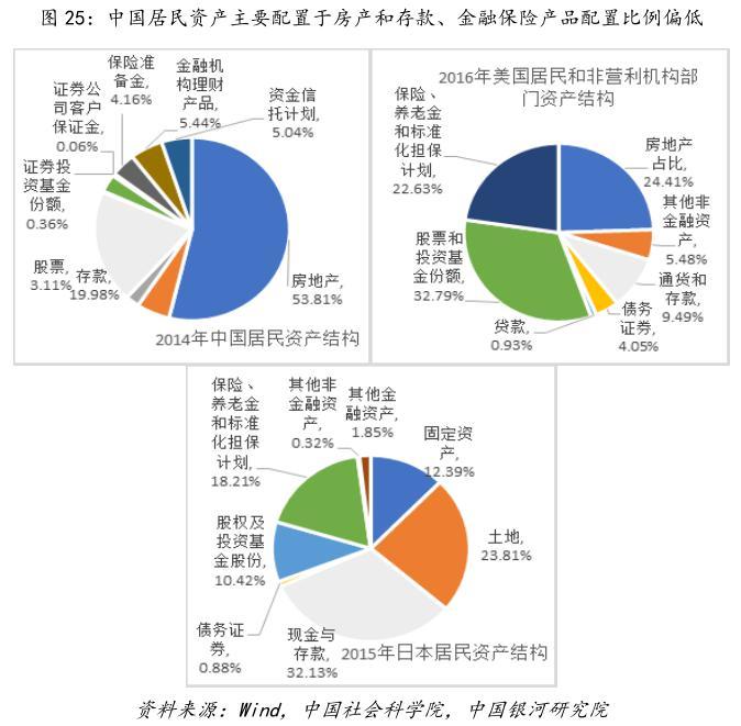 2014年我国居民对股票基金和保险的配置都不到4%(社科院统计,如图25上左所示),2016年美国家庭在股票和投资基金份额以及保险、养老金和标准化担保计划上的资产配置比例高达32.8%和22.6%(如图25上右所示),日本家庭的股权及投资基金配置比例也有6.8%(如图25下图所示)。我国居民长期资产配置和投资风险管理的能力有待提高,金融市场所能提供的长期投资产品有待丰富。