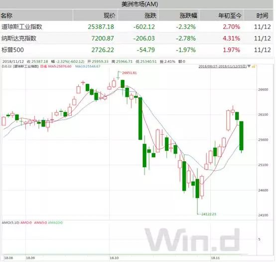 11月12日夜间,美股三大指数大幅收跌,道指、纳指重挫超过2%。