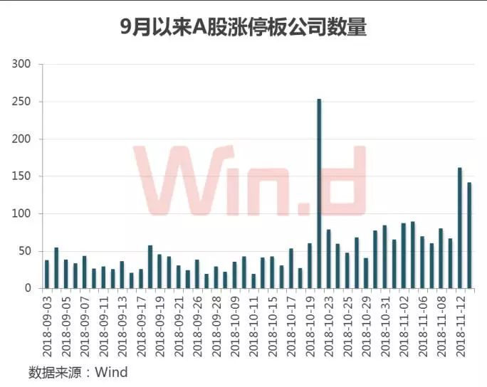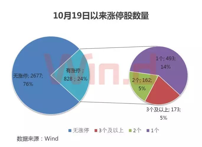 Wind统计显示,9月至10月上旬,A股每日涨停板公司数量基本维持在50只以内,而在10月19日以后,每日涨停板公司数量快速增加,仅有两天低于50只,其余时间均在50只以上,甚至有3天涨停板公司数量均超过100只。