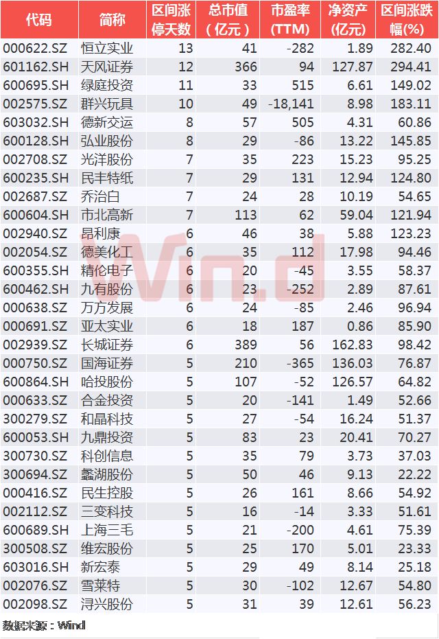 Wind统计显示,10月19日以来,有55家公司收获5个及以上涨停,其中非ST公司有31家,ST公司(含*ST)有24家。非ST公司中,恒立实业、天风证券、绿庭投资、群兴玩具区间涨停板数量均超过10个,区间涨幅均超过100%。此外,弘业股份、民丰特纸、市北高新、昂利康涨幅亦超过100%。