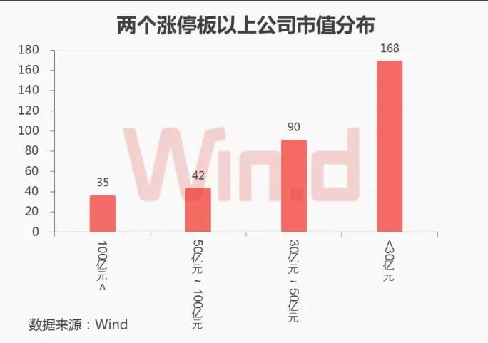 Wind统计显示,在10月19以来收获两个涨停板的公司总市值分布来看,总市值大于100亿的公司仅35家,50亿到100亿之间的有42家,30亿到50亿之间的有90家,30亿以下的有168家。可见,小市值公司是近期连续涨停的主力。