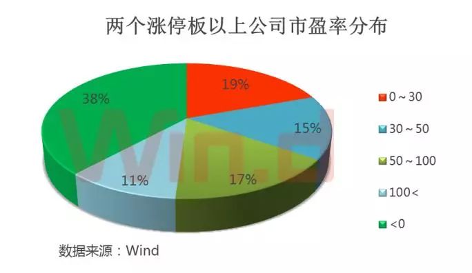 Wind统计显示,在10月19以来收获2个涨停板的公司估值分布来看,市盈率30倍以内的公司仅65家,占比19%;市盈率30倍-50倍之间的公司有51家,占比15%;市盈率50倍-100倍之间的公司有55家,占比17%;市盈率大于100倍的公司有36家,占比11%;甚至还有128家公司业绩亏损市盈率为负,占比38%。可见多数公司业绩不太理想。