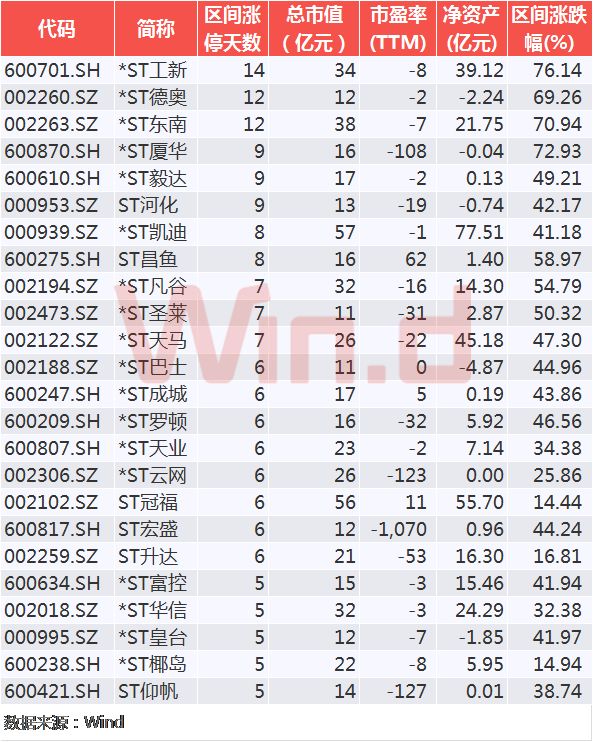在ST公司中,*ST工新、*ST德奥、*ST东南均收获超过10个以上涨停,且从ST公司市值来看,均较小,且少数公司净资产为负,已经资不抵债。对于此类公司的炒作,投资者仍需保持谨慎。