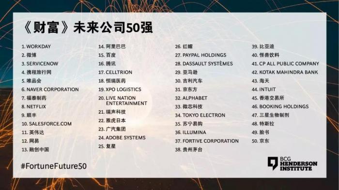 当晚,由波士顿咨询联合《财富》杂志合作的《财富》未来公司50强榜单出炉。两大机构强强联合,将评选范围扩张到全球1000多家企业,这些企业的入选门槛是年销售额达到100亿美元或市值达到200亿美元。