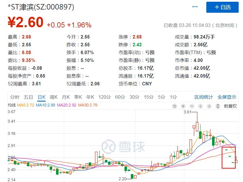 而自披星戴帽以来,*ST津滨已录得3个一字跌停,截止今日收盘,股价报2.6元/股。
