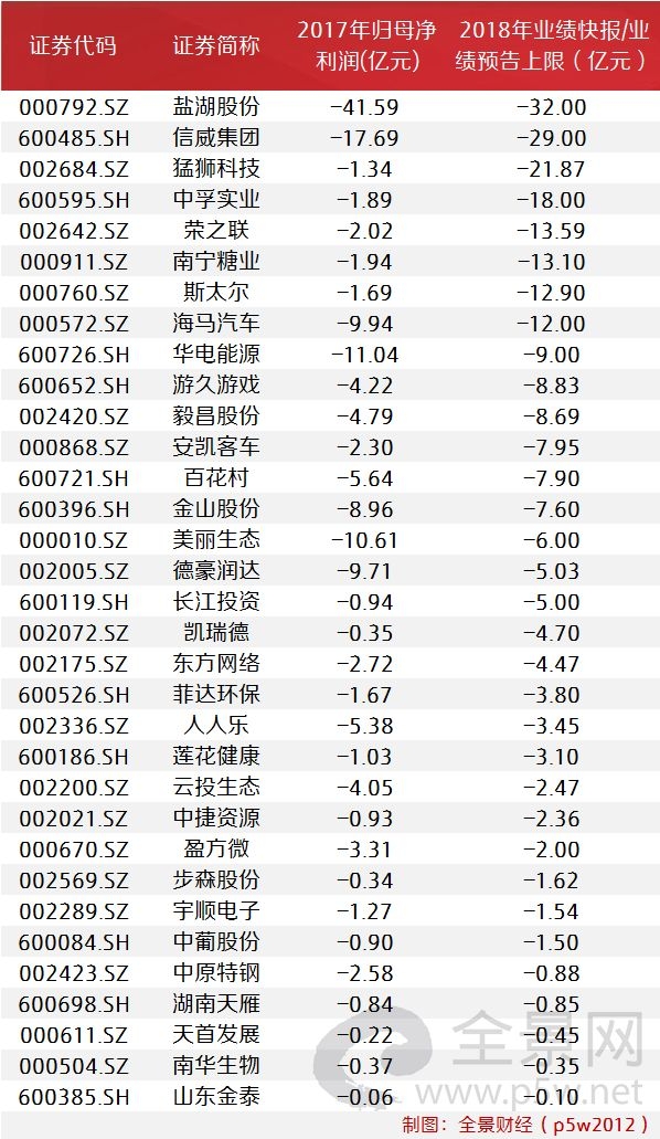 而33只未被ST的个股中,亏损最高的为盐湖股份(000792),其于1月24日预计2018年亏损32亿元至35亿元,2017年已经巨亏41.59亿元。
