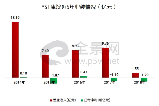 *ST津滨2018年实现营收1.55亿元,同比下滑84.14%;归母净利润为-1.29亿元,同比下滑8.48%;