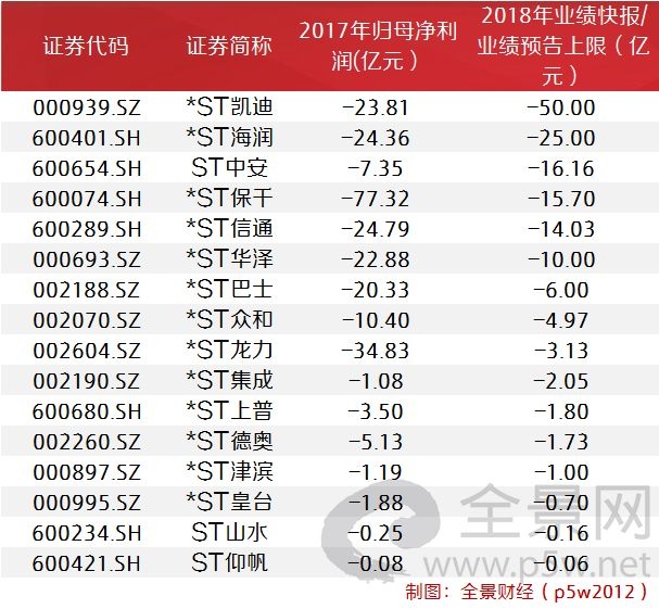 此外,*ST海润、ST中安、*ST保千等个股2018年预亏均超过10亿元。