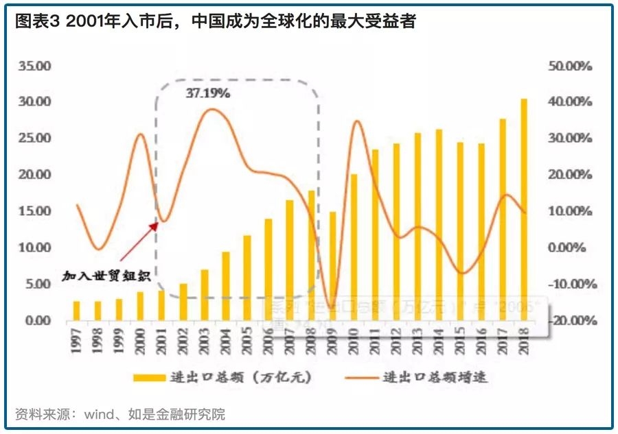 从增速上来说,中国进入世贸组织之后,进出口总额平均增速高达14.55%,同期GDP增速为13.31%,贸易增速高于同期GDP增速。