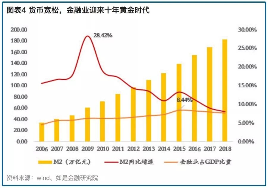 2008年,我们的M2还不足50万亿,现在已经超过180万亿,货币增长带来了金融泡沫的繁荣。2016年,我国金融业占GDP的比例一度达到8.4%,远远超过了美国日本等发达国家,显然是过度的繁荣。