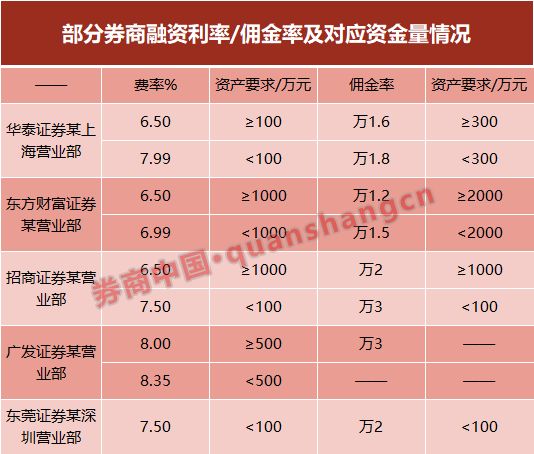 “账户资产1000万元以上的,利率可以申请到6.5%-7%,交易佣金万2;几百万资产的,利率7%,交易佣金万3;不足100万的,利率7.5%,佣金万3。”招商证券某营业部经理说道。