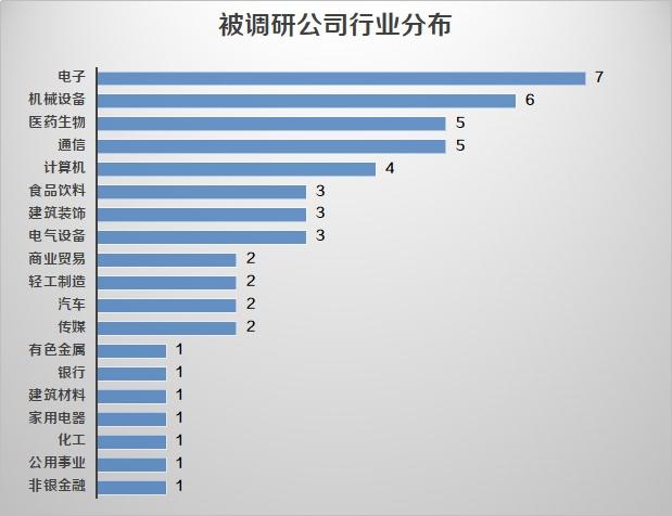 从行业分布来看,电子依然最受关注,大华股份(002236.SZ)、中颖电子(300327.SZ)、奥拓电子(002587.SZ)等7家公司被调研。机械设备随后,通信行业连续两周被关注。