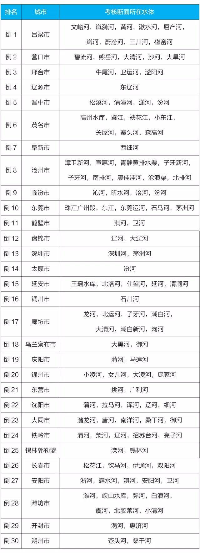 据悉,从2019年第一季度起,环境部将每季度开展地级及以上城市国家地表水考核断面水环境质量状况及变化情况排名,公开发布国家地表水考核断面水环境质量相对较好的前30位城市和相对较差的后30位城市名单、与上年同期相比水环境质量改善幅度相对较好的前30位城市和相对较差的后30位城市名单,以及该城市相对应的国家地表水考核断面所在水体的名称。