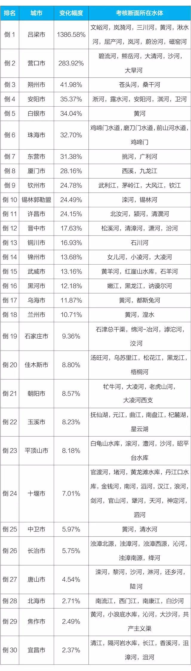 除了水质,环境部还公布了水质变化情况。山西吕梁、辽宁营口、山西朔州恶化最严重。恶化最严重的30个城市,还有多个南方城市,包括珠海、厦门、玉溪、十堰、北海等。其中珠海、厦门是著名沿海城市,湖北十堰是南水北调的源头城市,广西北海是著名旅游城市。