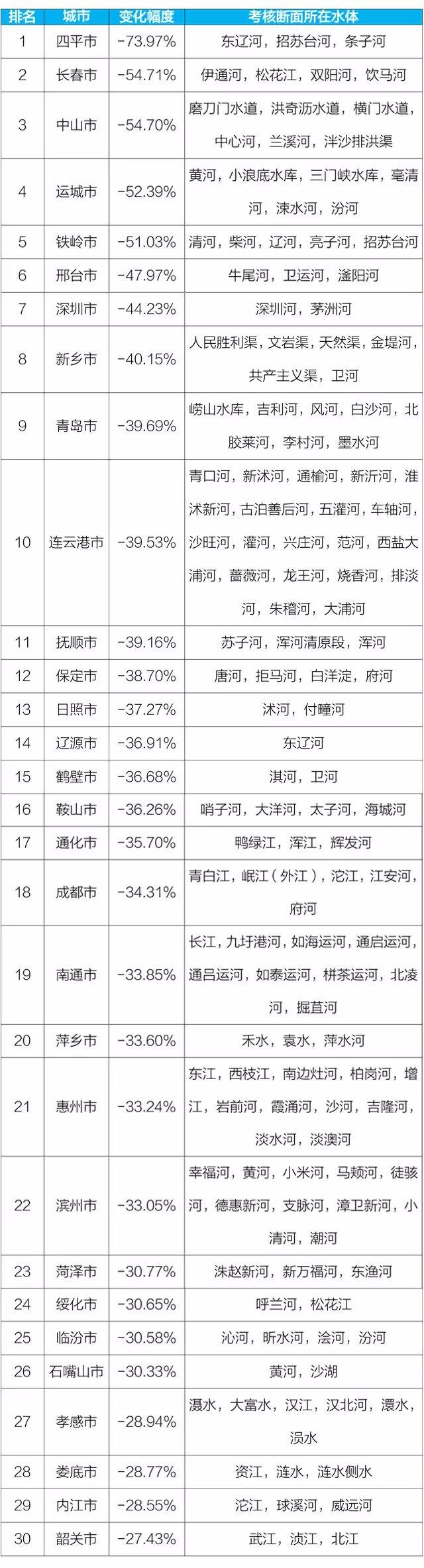 2019年1-3月国家地表水考核断面水质变化情况排名前30位城市及所在水体