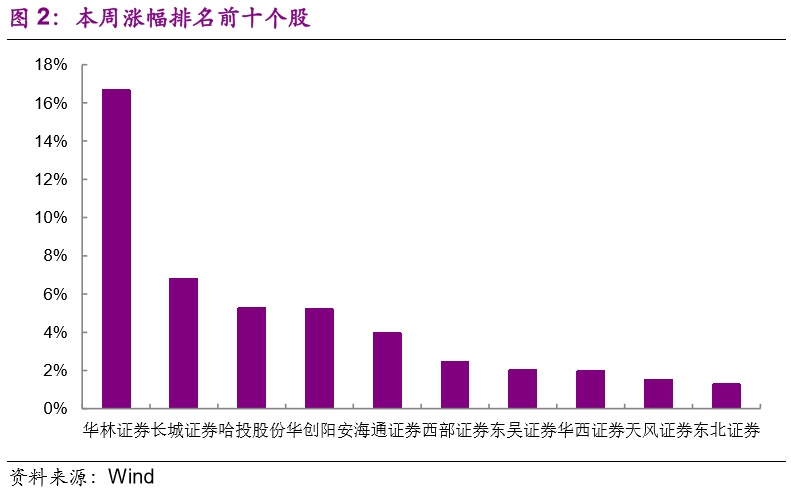本周板块涨幅排名前十个股:华林证券(+17%)、长城证券(+7%)、哈投股份(+5%)、华创阳安(+5%)、海通证券(+4%)、西部证券(+2%)、东吴证券(+2%)、华西证券(+2%)、天风证券(+2%)、东北证券(+1%)。