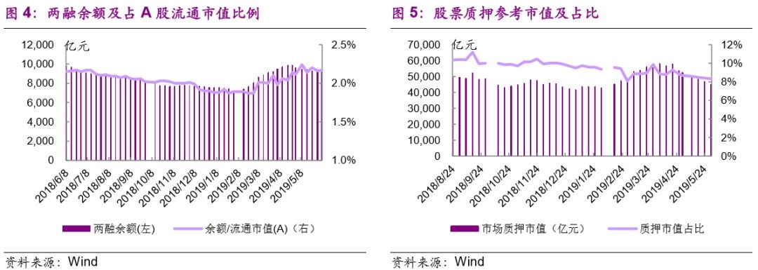 截至6月6日,融资融券余额9,150亿元,环比下降0.81%,占A股流通市值比例为2.17%。两融交易额占A股成交额比例7.05%,环比下降0.88ppts。截至5月31日股票质押参考市值为45,110亿元,质押市值占比8.32%,环比下降0.07ppts。