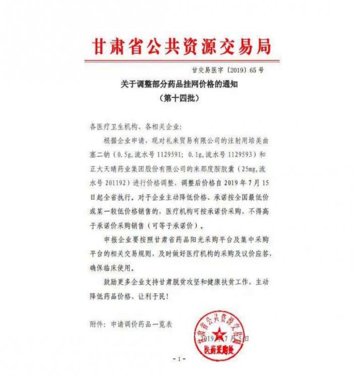7月5日,甘肃省公共资源交易局医药采购处发布《关于调整部分药品挂网价格的通知(第十四批)》