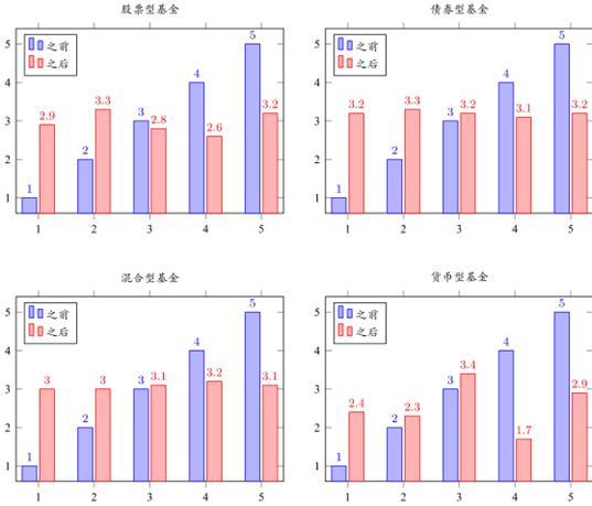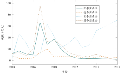 图2列出了单只基金所管理资产规模的中位数。可以看出,2009年之后,股票型、债券型、混合型基金的单只规模都大幅萎缩,只有货币型基金在持续扩张。