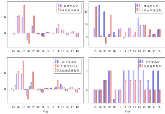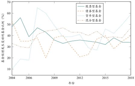 图3对比了基金业绩和基准回报率。2005年至2018年间,股票型、混合型基金的平均收益率在50%、43%的年份中低于A股综合收益率,债券型基金的平均收益率在57%的年份中低于上证企业债指数收益率。只有货币型基金的表现较好,其平均收益率总体略高于一年期定期存款利率。