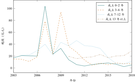 公募基金规模的增长主要源于基金数量的增加,这使得新基金发行时竞争愈加激烈,新基金的发行规模偏小。图4列出了成立年限不同的各组偏股型基金的平均规模。2009年以来,刚成立的基金规模显著小于之前年份。在2013、2015年以后,已成立3-6年和7-12年的基金规模也在缩水,只有成立超过13年以上的基金规模才比较稳定,说明偏股型基金的生存能力存在巨大挑战。