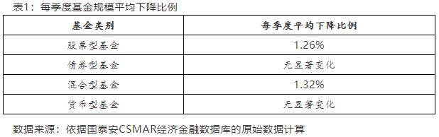 更为严重的是,很多偏股型基金在发行后持续失血。我们用回归统计方法计算了基金规模与成立年限长短的关系。表1显示,股票型、混合型基金规模平均每季度会下降1.26%和2.32%,也即每年下降5%和9.2%。在这种失血速度下,不要说“基业长青”,恐怕不出10年就会面临清盘危机。而相反,债券型、货币型基金则不存在显著的下降趋势。