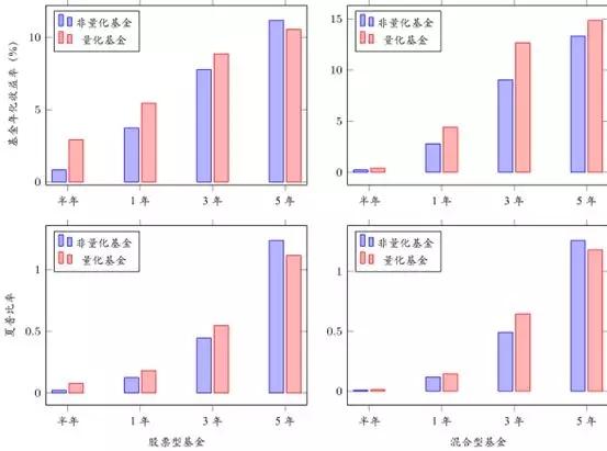 更重要的是,量化基金的业绩也显著地优于非量化基金。图12显示,量化基金的半年、1年、3年期收益率、夏普比率都高于非量化基金。这说明,量化基金在投资回报和业绩稳定性方面的确具有优势。