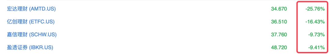 其中美国本土券商股最惨。亚美利交易(AMTD)暴跌25.76%,亿创理财暴跌(ETFC)16.43%, 而始作俑者——嘉信理财(SCHW)跌幅也高达9.73%,一夜之间总市值蒸发了350亿元,目前总市值494亿美元(约3458亿元人民币)