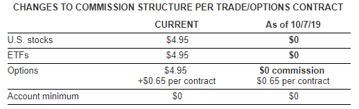 该公司表示,从2019年10月7日开始,该公司将把美国股票、ETF和期权在线交易佣金从4.95美元降至零。期权合同价格仍将为每份合约65美分。