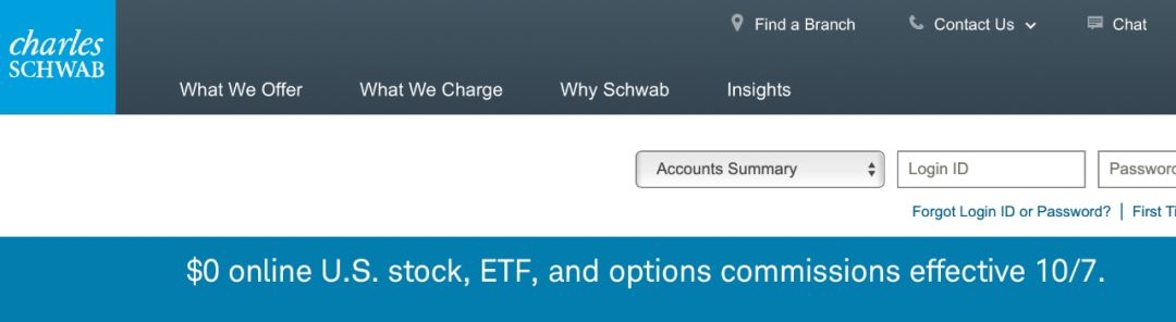 10月1日美股开盘前,嘉信理财(Charles Schwab Corp.)表示,将取消所有移动和网络交易渠道在美国或加拿大交易所上市的股票、ETF和期权的佣金。