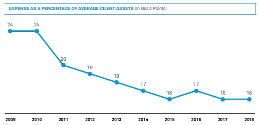 在资产管理方面,嘉信理财客户的平均投资成本从2009年的0.24%,已经逐步降低到2019年的0.16%。这对于3.3万亿美元的客户资产来说,仅交易成本一项就节省了26亿美元。