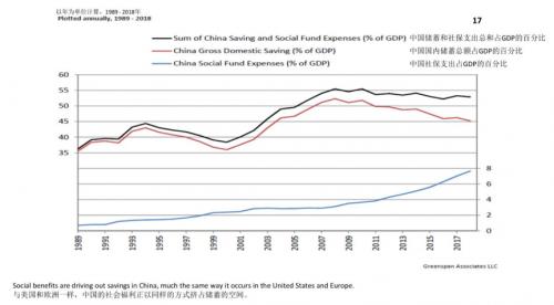 第十七张图表展示的是社会福利,中国的储蓄和社保支出之间,以及占GDP的比例,中国的社会福利正在以美国和英国同样的方式挤占着储蓄的空间,我发现这样的一个过程,在全球大部分国家都在上演。