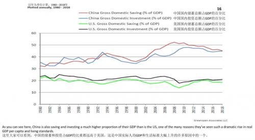 第十六张图表,中国的储蓄和投资占到GDP的比重要远高于美国,这是中国实际人均GDP和生活标准大幅上升的许多原因中的一个。