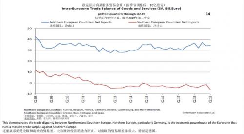 再看一下十四张图表,具体分析一下欧元区商品贸易额商品之间的关系,这是展示的是北欧和南欧之间的贸易差。北欧地区仍然是欧洲的经济动力所在,对南欧贸易顺差是非常大的,特别是德国。