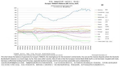 第十三张表,这是从欧洲的角度,其实现在欧洲的情况是比较复杂的,非常明显。现在最让我担心的欧洲的情况是非常具体的,也就是欧洲整个TARGET2系统(欧洲各央行间的清算系统)的支付余额。这是欧元区央行的清算行所的数据,大部分的差额,包括德意志银行的余额差值,我觉得其他欧洲的国家,可以看到非常显著的分化,德国央行的余额远高于其他国家,欧洲央行本身是处于净借入状态,再加上贸易的作用,德国为欧洲很大一部分提供特别多的资金,再加上贸易的情况,很有可能德国是欧洲整个金融体系当中最主要的提供资金者。卢森堡也是一样,还包括其他的一些分支机构,都为它提供了资金的借入,尤其是德国扮演了这样一个提供资金者的角色,特别是给南欧,但我不知道这样的角色能持续多久。