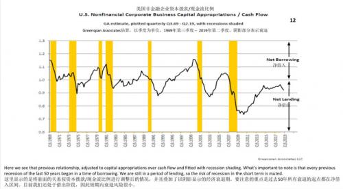 第十二张表,这体现了一个应变量,并且叠加了经济衰退期,在过去50年当中,所有衰退的起点都在净借入区间,目前我们还处于借出阶段,因此短期内衰退的风险是很小的。每周工业产值的差额在不断减小,还包括工业产品生产的数量也在缩小,但是现在还不能把它叫做是一个衰退的开始。毫无疑问的经济走弱,包括工业领域的一些变化,全球很多地区都出现了类似的情况。这里要回答的一个问题是,从这边到那边,也就是从现在到未来会有什么样的变化,等一下我会在提问的时间跟大家讲。