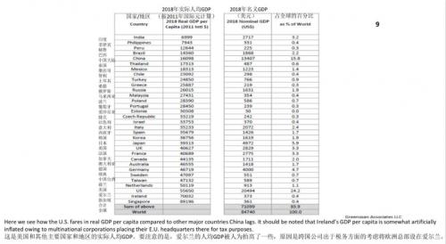 图八,美国和其他主要国家和地区的实际人均GDP,中国低一些,但要注意的是爱尔兰的人均GDP被人们抬高了一些,原因是跨国公司处于税务方面的考虑,将在欧洲的总部设在爱尔兰。