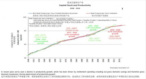 图六,我们可以看到这笔从国外借来的资金,体现为美国的国际投资净额,目前已经接近10万亿美元,15年前,甚至是更早的时候,它是非常稳的,而近期发生了最大的变化。而近年来,我们发现生产力的增速有所下降,原因是福利的支出挤占了国内储蓄总额的空间,进而挤出了国内投资总额。国内投资总额是生产力增长的主要决定性的因素。