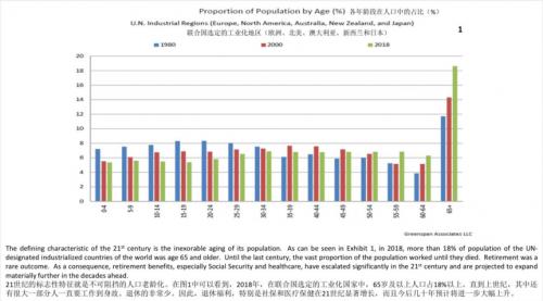 21世纪最大的特征是人口的老龄化,大家在图一中可以看到,在2018年,联合国选定的工业化国家中,65岁及以上人口占18%以上。直到上个世纪,其中有很大一部分一直要工作到死亡,能退休的人是非常少的。因此,退休的福利,特别是美国的社保和美国的医保,在21世纪有显著的增长,而且今后几十年预计会进一步大幅上升。