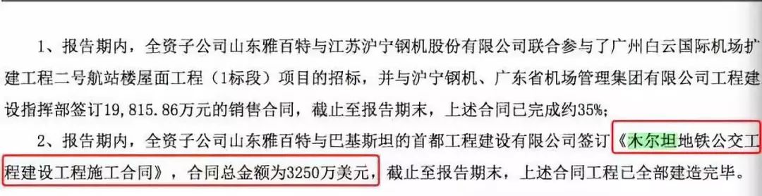 在2015年报中雅百特表示,公司全资子公司山东雅百特与巴基斯坦的首都工程建设有限公司签订《木尔坦地铁公交工程建设工程施工合同》,合同总金额3250万美元(约合2.12亿元人民币)。