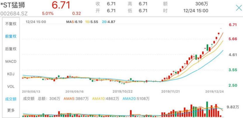 个股中反弹幅度最大的是*ST猛狮,从10月底的2.5元飙升至6.71元,最大涨幅接近170%,该股前三季度亏损逾7亿元。